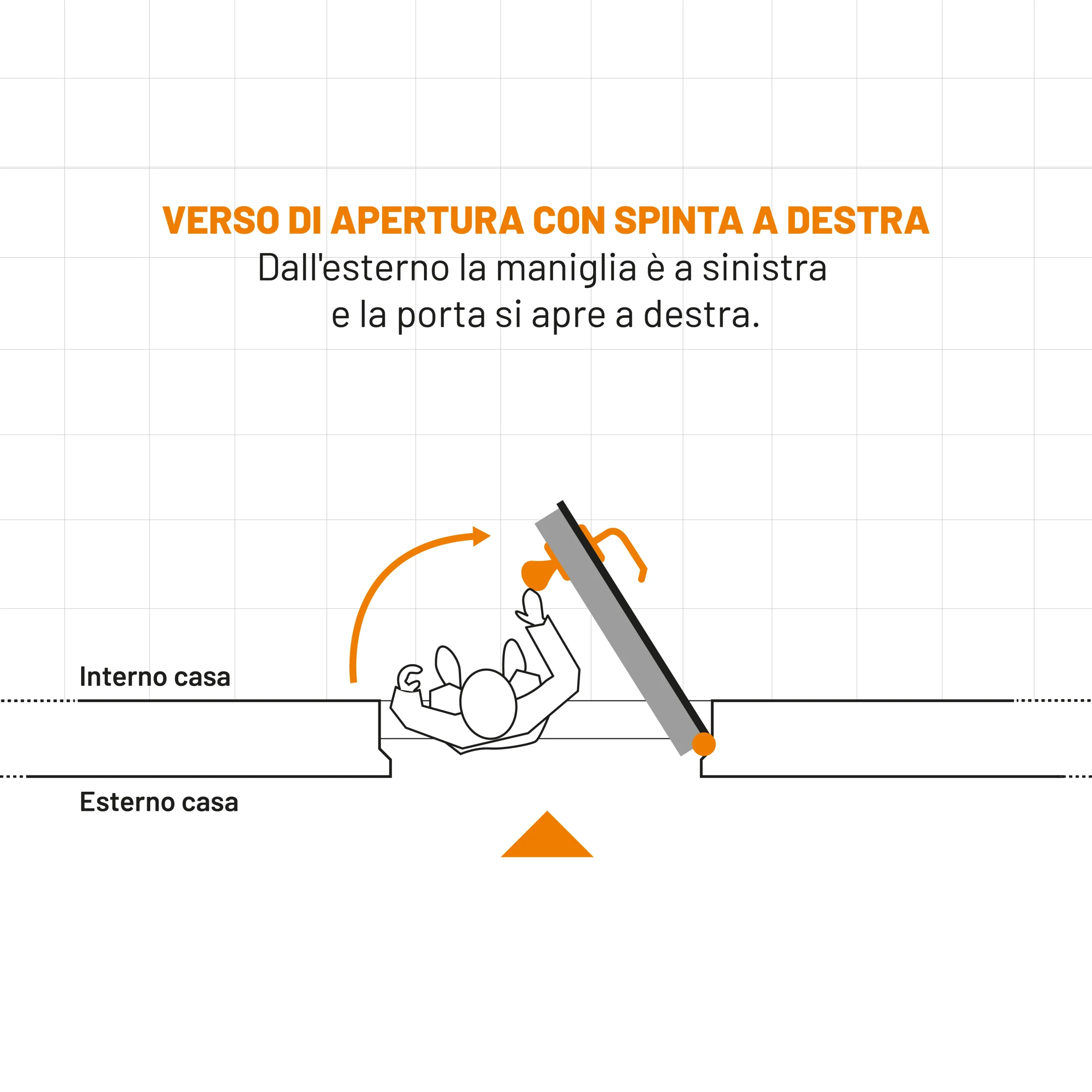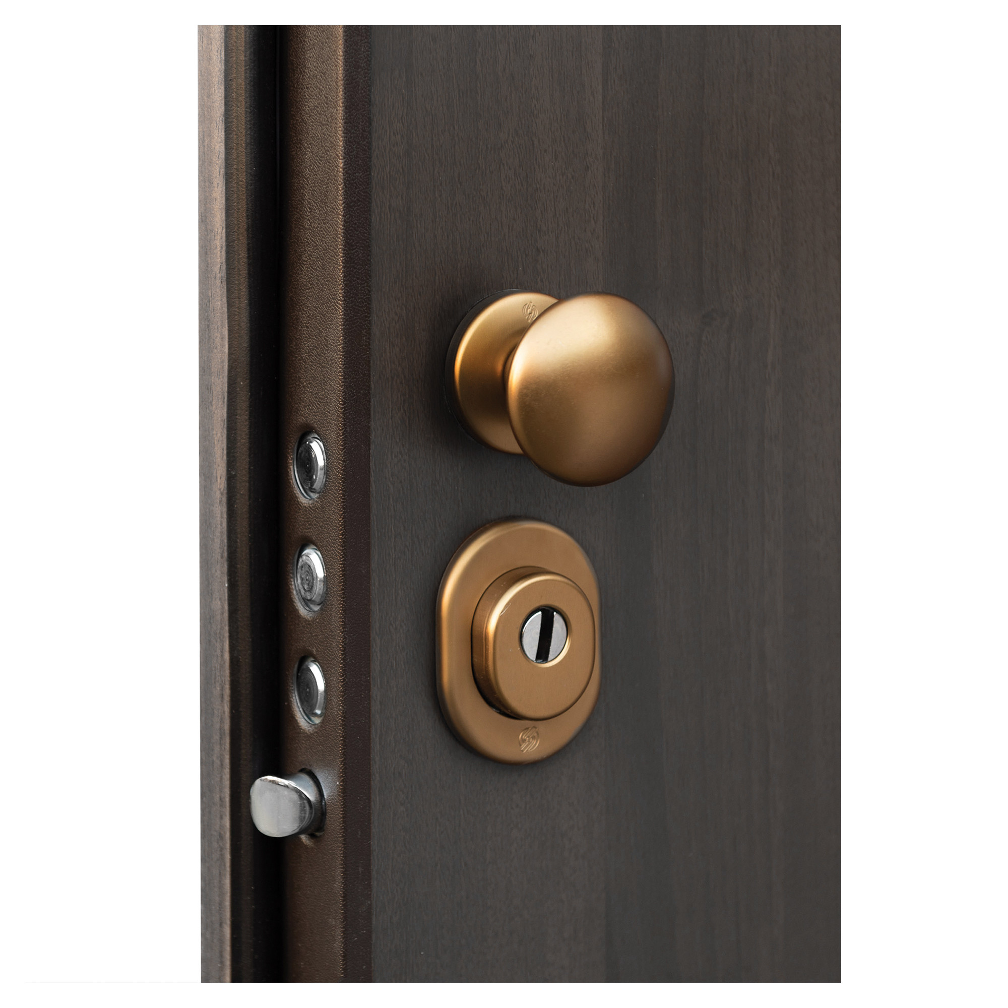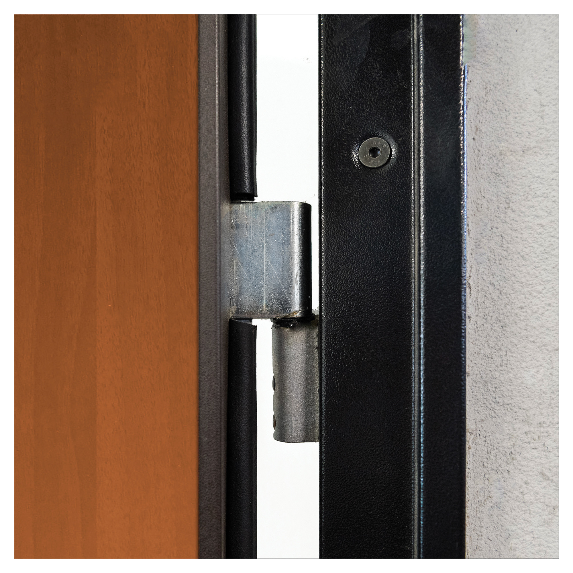 The Steel security entrance door opens to the right and is 210 cm high and 90 cm wide. The required opening dimensions are 215.9 cm high and 103 cm wide. The internal panel is medium Tanganyika and the external panel is medium Tanganyika. The door has double insulated sheet metal and two 10/10 + 5/10 vertical reinforcements. The security door has eight anchoring points and is equipped with a Securemme lock and a Euro cylinder. The frame is galvanized and pre-filmed 15/10. The casing is made of galvanized steel, and the hinges are triple-adjustable. It comes complete with a handle and knob, spyhole, draft excluder, three keys and a construction key. The security door is certified for noise reduction of 31.2 dBA, burglar resistance class 2, thermal transmittance 1.47 kJ, and wind resistance class 5. The product is made in Italy. COUNTERFRAME SOLD SEPARATELY REF. 10019546